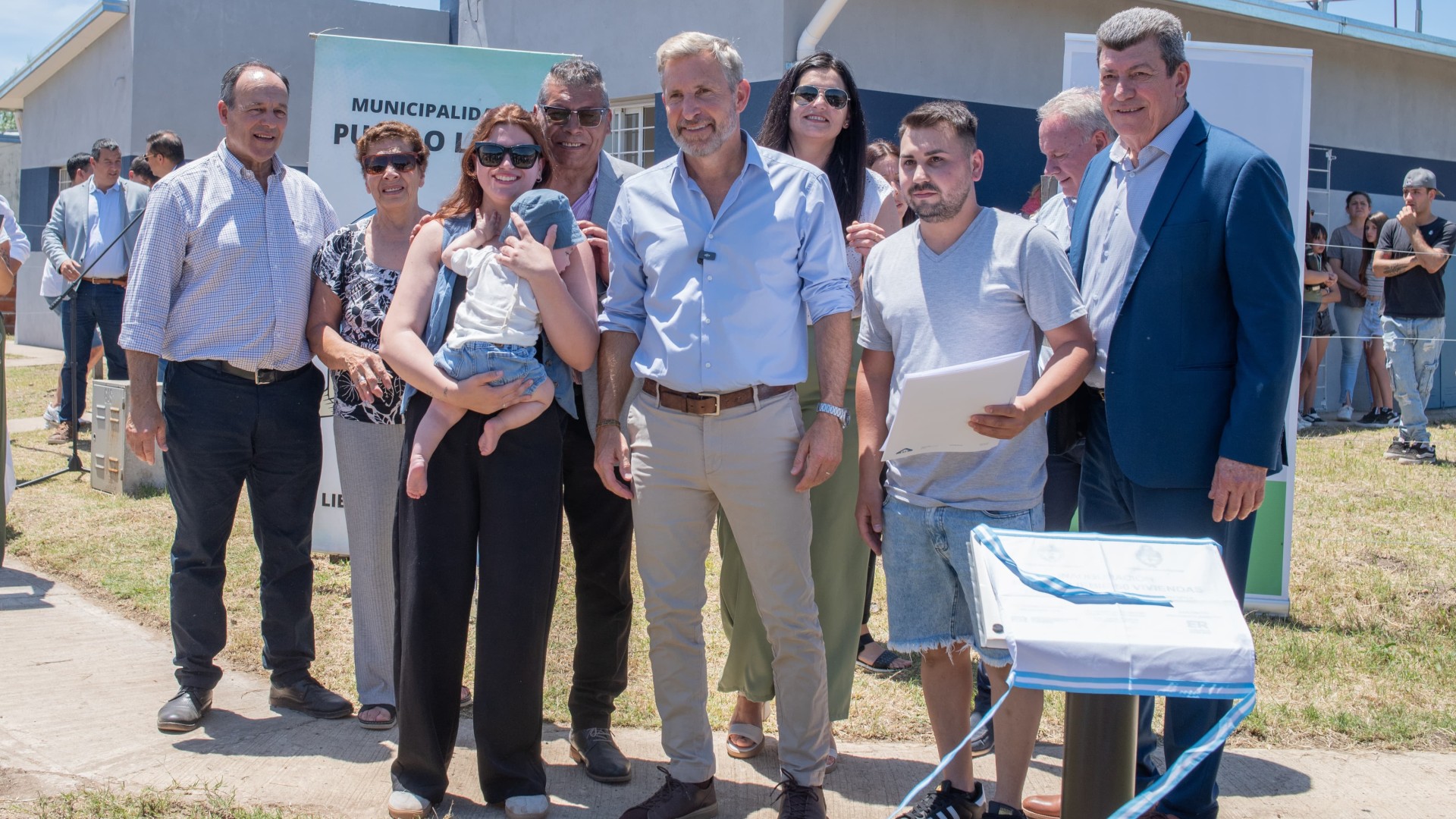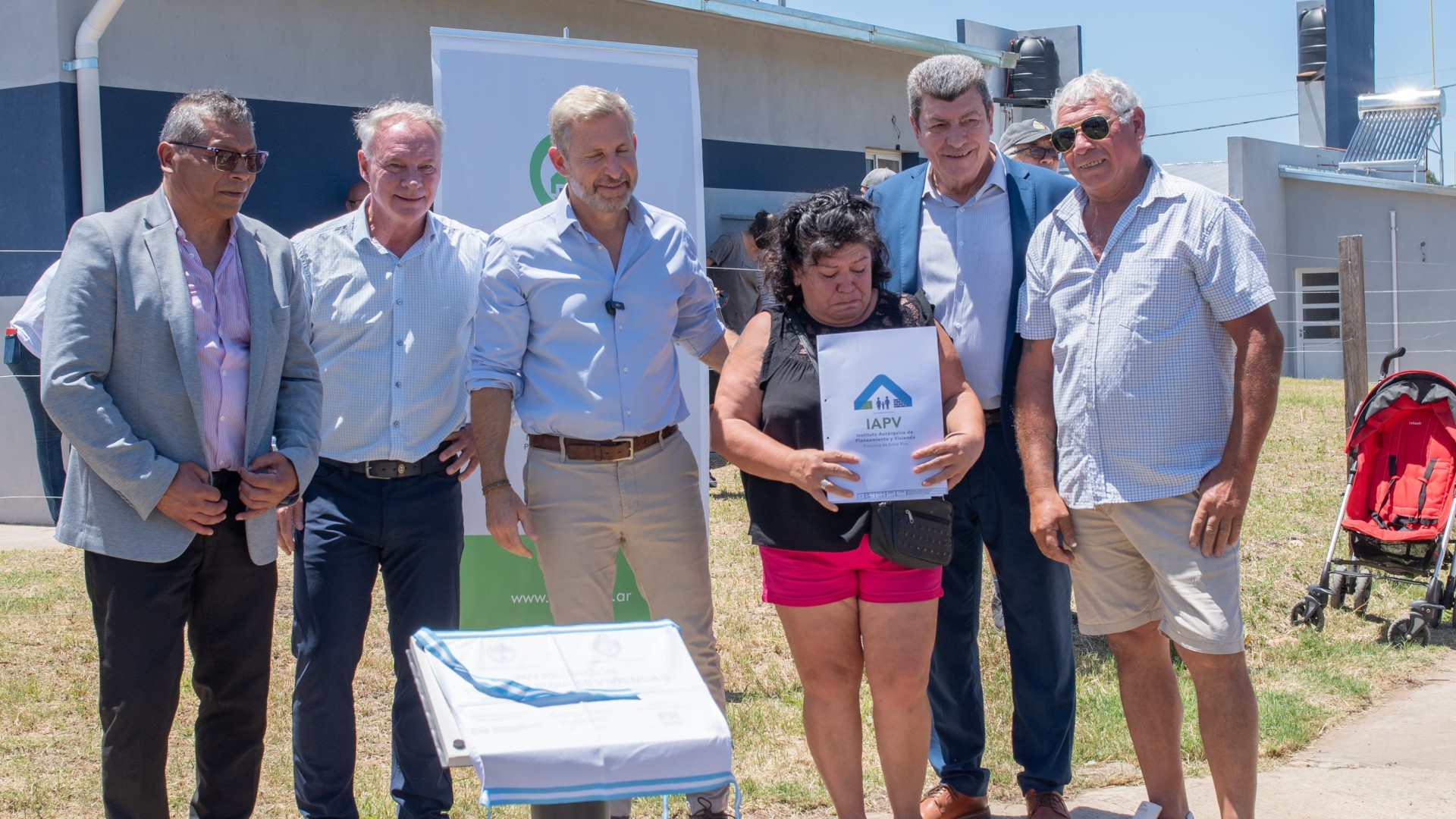 Acompañado por el intendente Julio Pintos, el mandatario entregó las llaves de las nuevas unidades habitacionales a sus beneficiarios. Las viviendas fueron construidas por el IAPV en el marco del Programa Casa Propia, con financiamiento conjunto entre provincia y Nación.